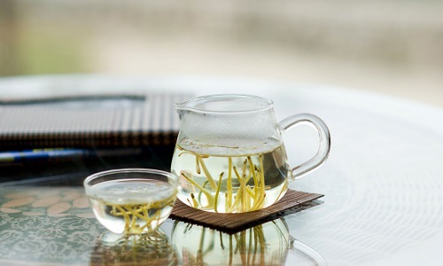 金銀花茶屬于花茶類,是用優(yōu)質(zhì)綠茶為素坯、加以新鮮金銀花,按金銀花茶窨制工藝窨制而成。夏季為金銀花的采摘期,花初開(kāi)時(shí)為純白色,翌日變?yōu)辄S色,香氣逐漸散失,因此以開(kāi)花當(dāng)天采摘最好。