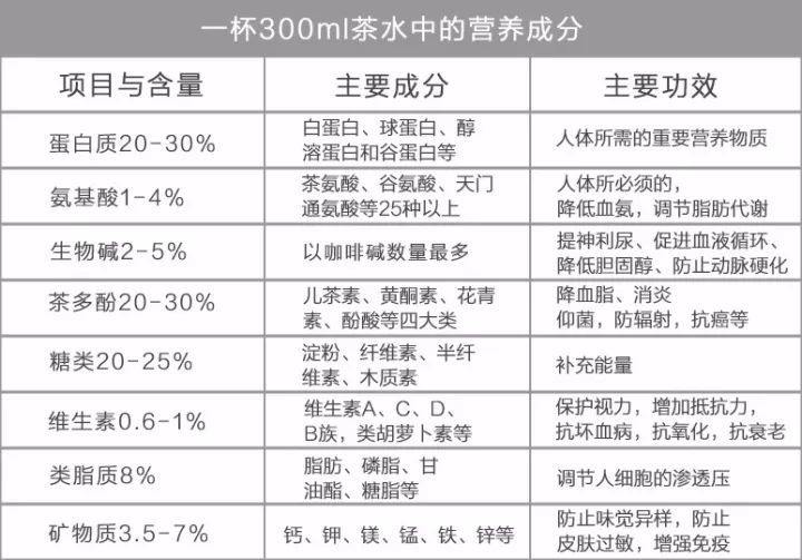據(jù)科學家分析和鑒定,茶葉中含有300多種對人體有益的化學成分。其中包含大量的蛋白質、氨基酸、脂肪、碳水化合物、礦物質、微量元素以及維生素,其中維生素多達10余種,泡茶時多數(shù)可溶解在水中,能被充分利用。