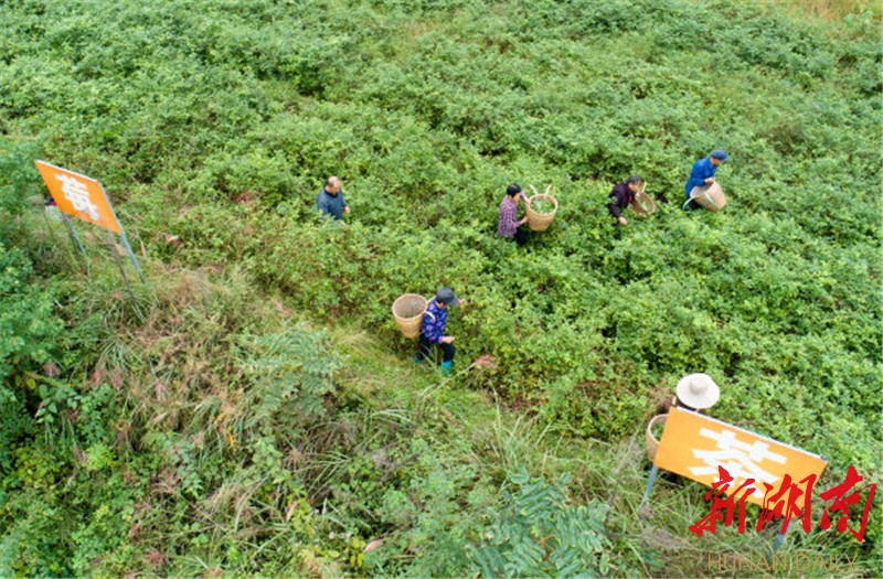(10月10日,張家界市永定區(qū)教字埡鎮(zhèn)七家坪村,村民在莓茶專業(yè)合作社采摘莓茶。)