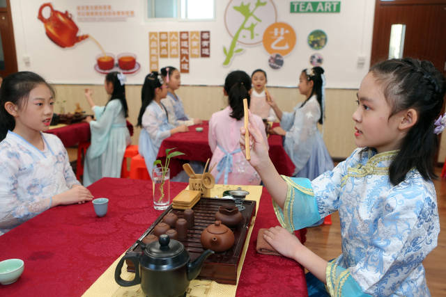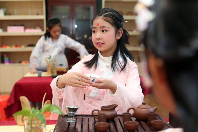 日前,天津市和平區(qū)哈密道小學(xué)舉行“以華服之美,致敬茶事之道”校園茶藝展示活動,組織學(xué)生們進(jìn)行茶服和茶藝展示,在校園里弘揚(yáng)傳統(tǒng)文化。