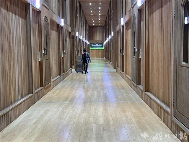 走進(jìn)“洞茶木倉”,只見內(nèi)部空間被分割成一間間木屋。透過木門上的玻璃,可見木屋內(nèi)堆碼整齊的一箱箱青磚茶成品。木屋內(nèi),保持適宜青磚茶存儲的恒溫恒濕環(huán)境。一個木屋就是一個倉,“洞茶木倉”一共48個倉,每個倉可存放20噸青磚茶。