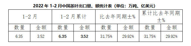 據(jù)中國海關(guān)數(shù)據(jù),2022年1-2月,中國茶葉出口量為6.35萬噸,同比增長31.75%,出口額為3.52億美元,同比增長29.92%,1-2月出口均價為5.54美元/千克,比去年同期微降1.39%。