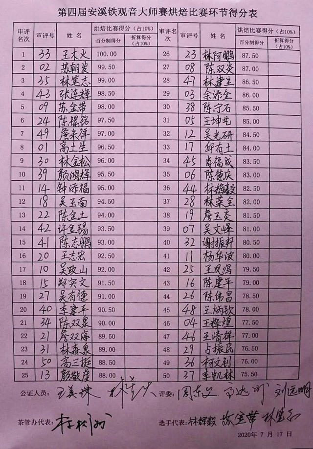 據(jù)主辦方介紹,今年舉辦的第四屆安溪鐵觀音大師賽延續(xù)了前三屆大師賽的賽制規(guī)則。根據(jù)規(guī)則,烘焙比賽要求選手必須在規(guī)定的8個(gè)小時(shí)內(nèi)用烘焙組委會(huì)統(tǒng)一提供的毛凈茶和烘焙機(jī)械,獨(dú)立完成烘焙。7月17日下午,本次烘焙比賽茶葉評(píng)審組四位評(píng)委對(duì)50位選手的烘焙茶樣進(jìn)行質(zhì)量審評(píng),按質(zhì)量高低排定名次。經(jīng)過(guò)四小時(shí)的認(rèn)真審評(píng),第四屆安溪鐵觀音大師賽烘焙比賽環(huán)節(jié)得分表出爐。